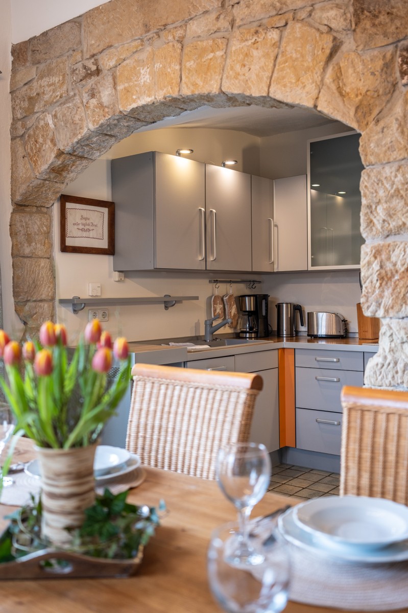 Das Apartment Pfaffenstein bietet auf 3 Etagen (110 m²) Platz für 6 Personen und verfügt über 3 Schlafzimmer, 1 Badezimmer mit Wanne/Dusche/WC und 1 Badezimmer mit Dusche/ WC, In der schönen Essdiele mit Küche und Terrasse und im gemütlichen Wohnzimmer können Sie gemeinsame Zeit verbringen . Das historische Sandsteinmauerwerk ist ein besondere Hingucker.