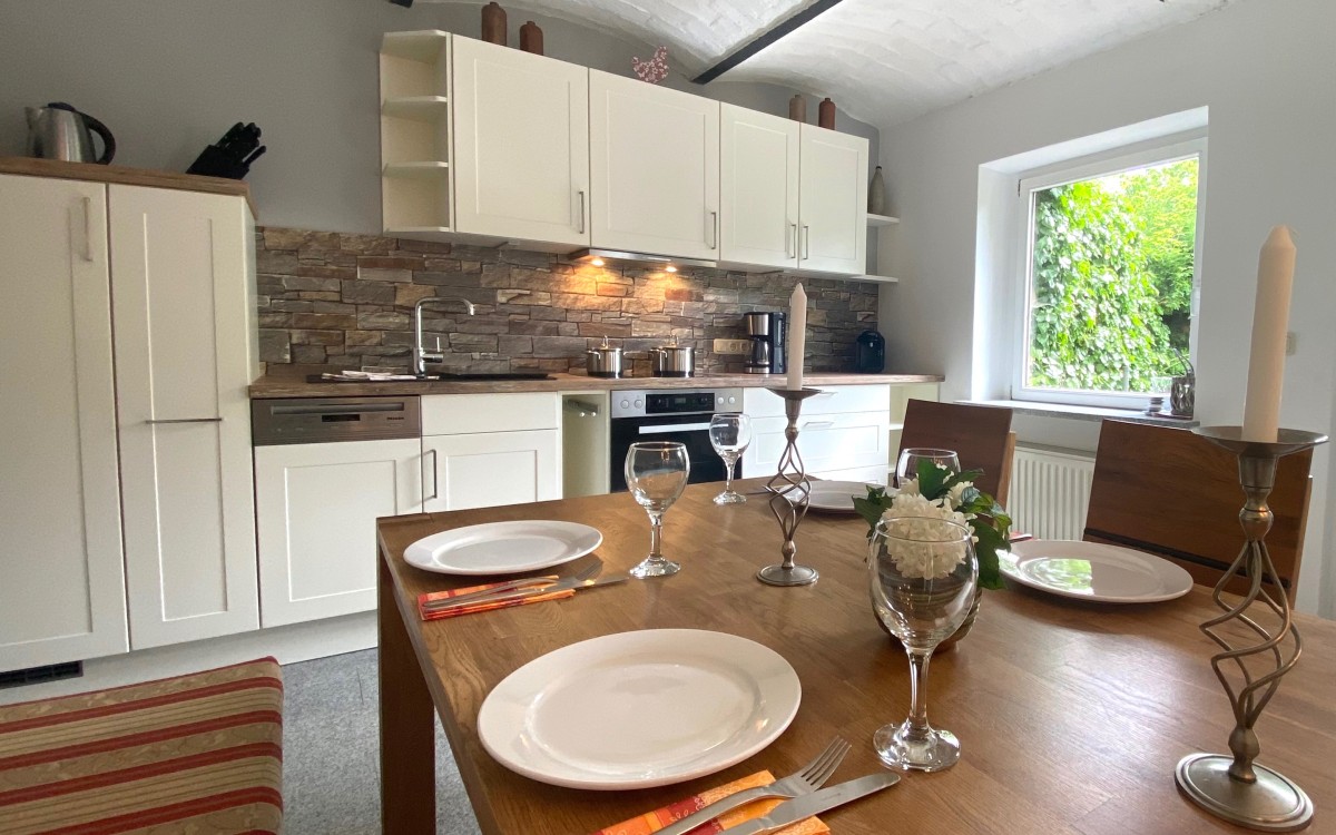 Das Ferienhaus befindet sich abseits der Strasse auf einem 2000 qm großen Grundstück mit altem Baumbestand und Panoramablick. Aus einer aus dem 19. Jahrhundert stammenden Scheune mit Pferdestall wurde das Ferienhaus umgebaut. In der Küche findet man noch heute das alte Gewölbe.
